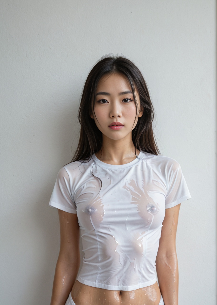 A tall and beautiful Asian beauty wearing wet white short sl...